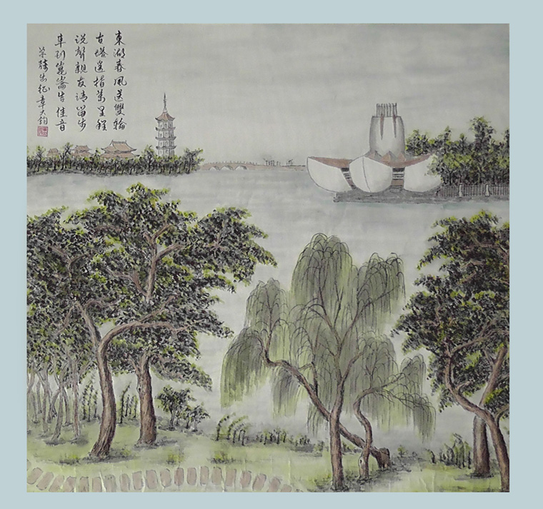 东湖春风送双轮,古塔遥指万里程。说声亲友请留步,车到昆仑告佳音。