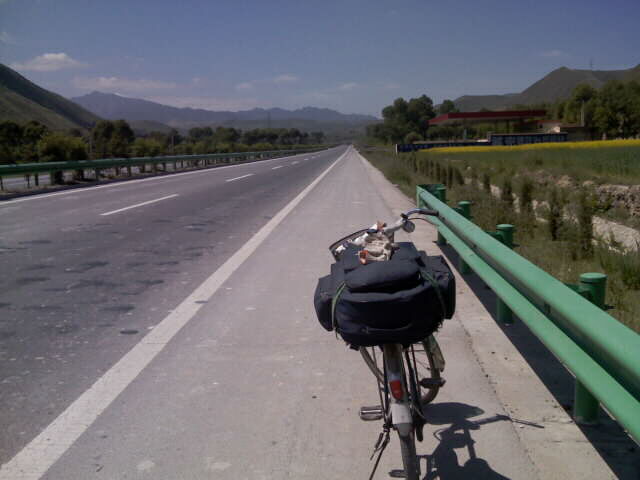 2009年7月2日 离西宁,经湟源(S2670M)翻日月山(S3446M),到达倒淌河(青藏高原第一镇,S3262,海拔升高了1000M) E100.56 N36.25 T7:45 V13.5 日程105KM 总程3829KM 到包头后沿黄河穿叉走了8天,到河口后又沿黄河的支流湟水河穿叉走了3天,过了湟源。此行告别了黄河,将绕过其源头,向长江源头进发。